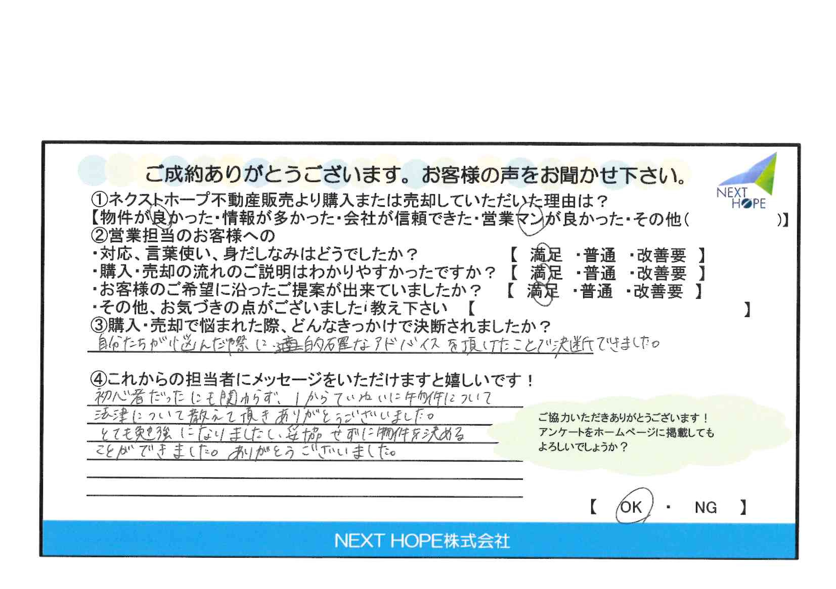 - ネクストホープ不動産販売より購入していただいた理由は?